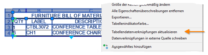 Extrahierte und in einer Tabelle platzierte Daten können anhand der ursprünglichen extrahierten Dateneinstellungen aktualisiert. Sie können beispielsweise zusätzliche Blöcke zu einer Zeichnung hinzufügen und können die der Tabelle zugewiesene Datenverknüpfung aktualisieren, um die letzten Blöcke einzuschließen, anstatt den Extraktionsprozess zu wiederholen.