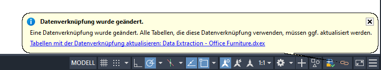 Tipp: Wenn mindestens eine Tabelle in einer Zeichnung extrahierte Daten enthält, wird das Symbol Datenverknüpfungen in der Taskleiste des AutoCAD-Anwendungsfensters angezeigt. Wenn das Symbol angezeigt wird, können Sie mit der rechten Maustaste darauf klicken, um die Datenverknüpfungen in einer Zeichnung zu verwalten und zu aktualisieren. Die Systemvariable DATALINKNOTIFY steuert die Darstellung und Funktionalität des Symbols Datenverknüpfungen.