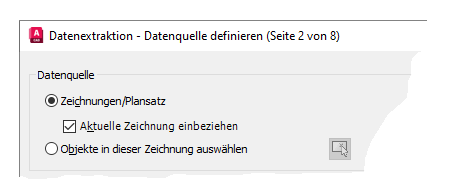 - Verwenden Sie die Optionen Zeichnungen/Plansatz und Aktuelle Zeichnung einbeziehen, und klicken Sie auf Weiter, um fortzufahren.