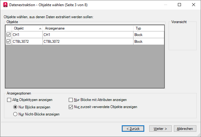 - Deaktivieren Sie das Kontrollkästchen Alle Objekttypen anzeigen und wählen Sie Nur Blöcke anzeigen und klicken Sie auf Weiter, um fortzufahren.