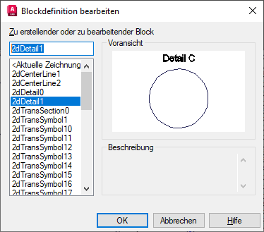 Doppelklicken Sie auf den Text Detail C oder auf den Kreis neben dem Text, um das Dialogfeld Blockdefinition bearbeiten anzuzeigen.