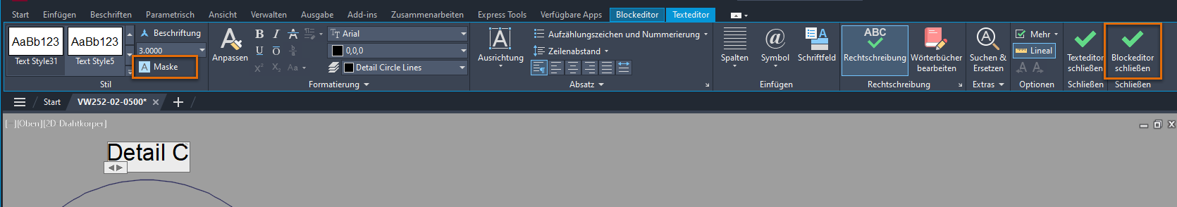 Doppelklicken Sie bei geöffnetem Block im Blockeditor auf das Absatztextobjekt Detail C, um es im integrierten MText-Editor zu bearbeiten.