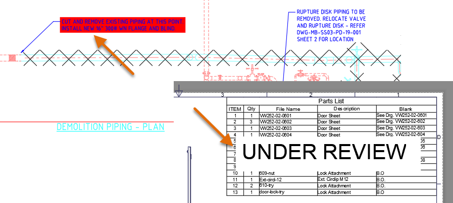 In der vorherigen Abbildung wird die Multi-Führungslinie oben links durch einen Texthintergrund hervorgehoben, während das Absatztextobjekt über der Tabelle den Leser darüber informiert, dass die Teileliste derzeit „überprüft“ wird.