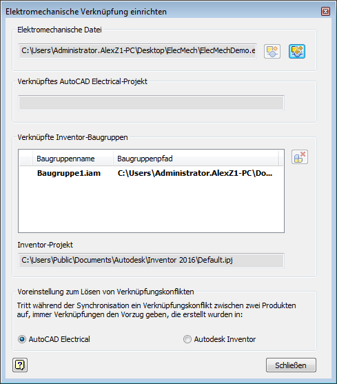 Um ein Inventor-Projekt mit einem AutoCAD Electrical toolset-Projekt zu verknüpfen, müssen Sie eine Verknüpfungsdatei erstellen und die beiden zu verknüpfenden Projekte definieren. Der Prozess umfasst zwei Schritte: