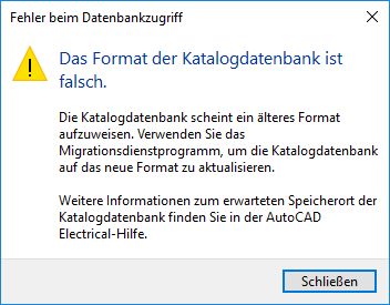Sie können die Katalogdatenbank durch Hinzufügen von Tabellen sowie durch Hinzufügen und Bearbeiten von Datensätzen anpassen. Einige Änderungen bewirken jedoch, dass das Programm die Katalogdatenbank nicht mehr verwenden kann. In diesem Fall sehen Sie die folgende Warnung.