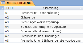 In diesem Beispiel ist "A1" der Code, der in der Tabelle MOTOR_I_DESC übereinstimmen muss (für "Trennschalter (ohne Sicherung)"), und "RATING1" ist das Attribut auf dem eingefügten Trennschaltersymbol, das den berechneten Ampere-Endwert erhalten soll.