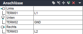 Geben Sie im Bereich Anschlüsse "GND" als Wert für KLEMME02 ein, und "L2" als Wert für KLEMME03.