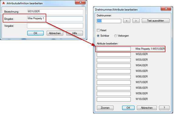 Die horizontalen und vertikalen Drahtnummernblöcke müssen das Attribut DRAHTNR haben. Die Blöcke können auch W01BENUTZER-W10BENUTZER-Attribute haben, die dazu dienen, dem Draht verschiedene Eigenschaften zuzuweisen. Wenn Sie Eingabeaufforderungswerte für W01BENUTZER-W10BENUTZER-Attribute auf dem Drahtnummernblock definieren, werden die Eingabeaufforderungen in die Bezeichnung aufgenommen, wenn Sie die Drahtnummer bearbeiten, um Werte zuzuweisen.