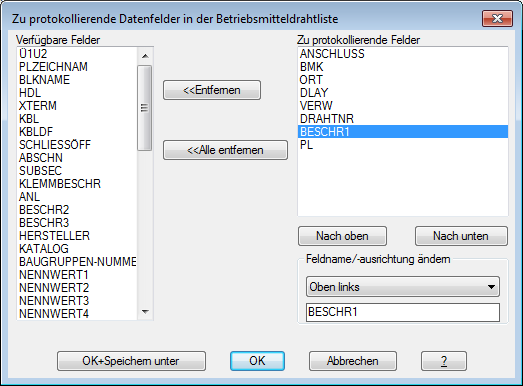 Beschr1 wird in die Liste Zu protokollierende Felder verschoben. Dabei handelt es sich um die Felder, die im Betriebsmittelbericht dargestellt werden.