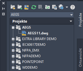 Im Projekt-Manager werden die Dateien unter dem Ordner AEGS aufgelistet. Neue Zeichnungen, die Sie ab jetzt hinzufügen, werden an das Ende der Zeichnungsreihenfolge angehängt. Sie können nun auf die Zeichnungen zugreifen, die Sie für die Übungen in diesem Handbuch benötigen.