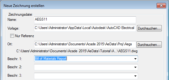 Sie können der Projektdatei für jede Zeichnung eine Beschreibung hinzufügen. Sie können die Zeichnungsbeschreibungen auch in Schriftfeldattributen verwenden und sie AutoCAD Electrical toolset-Berichten zuordnen.