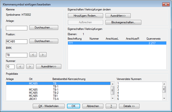 Die Hersteller- und Kataloginformationen für das ausgewählte Teil werden im Abschnitt Katalogdaten des Dialogfelds Klemmensymbol einfügen/bearbeiten angezeigt.