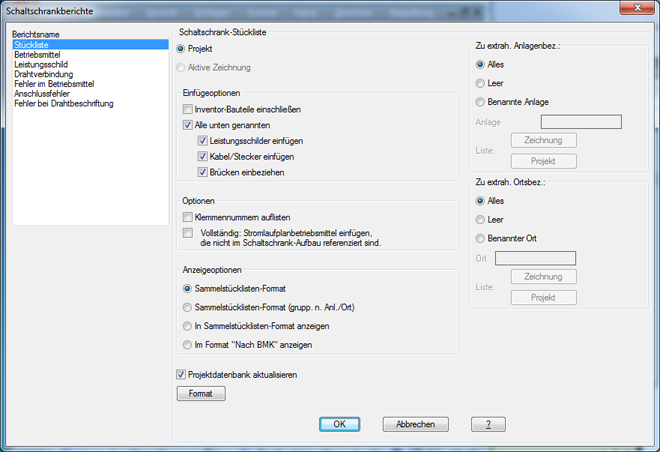Geben Sie an, ob das Projekt, die aktive Zeichnung oder ausgewählte Objekte verarbeitet werden sollen. Wenn Projekt ausgewählt ist, bieten einige Berichte eine Option zur Auswahl der zu verarbeitenden Zeichnungen.