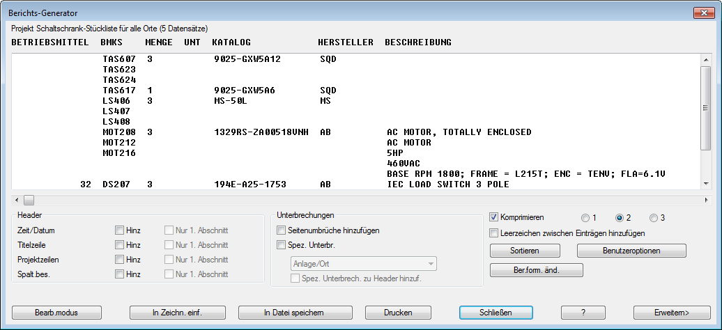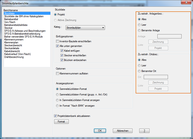 Standardmäßige Stromlaufplan- und Schaltschrankberichte werden zur Verfügung gestellt. Stromlaufplanberichte extrahieren nur die Daten aus Stromlaufplan-Betriebsmitteln. Schaltschrankberichte extrahieren Daten aus Schaltschrank-Betriebsmitteln. Die Ausnahme bildet die Schaltschrank-Stückliste, die beliebige Stromlaufplan-Betriebsmittel umfasst, die in keinem Schaltschrankaufbau vermerkt sind.