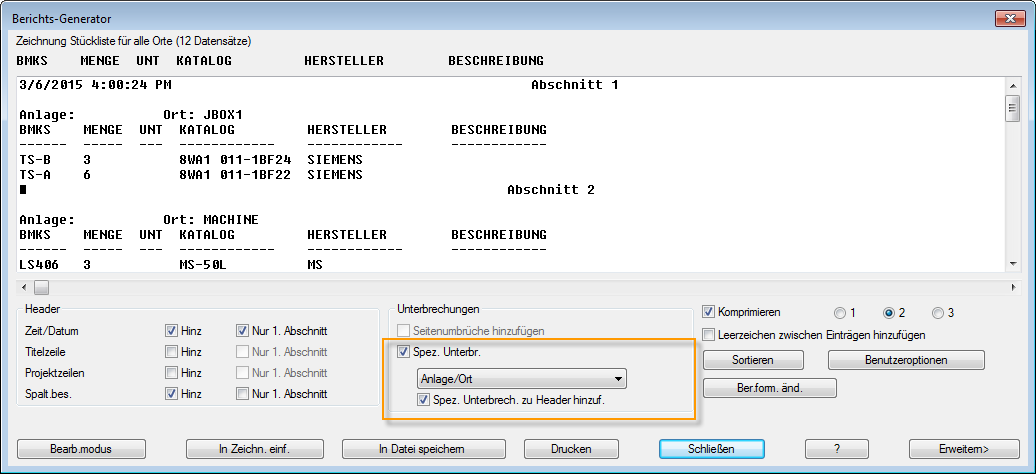 Wenn Sie die Option Spezielle Unterbrechung auswählen und auf In Zeichnung einf. klicken, steht die Option Spezielle Unterbrechungen anwenden im Dialogfeld Tabellenerzeugung einrichten zur Verfügung. Diese Option fügt für jeden Abschnitt ein Tabellenobjekt ein, das auf den speziellen Unterbrechungen basiert.