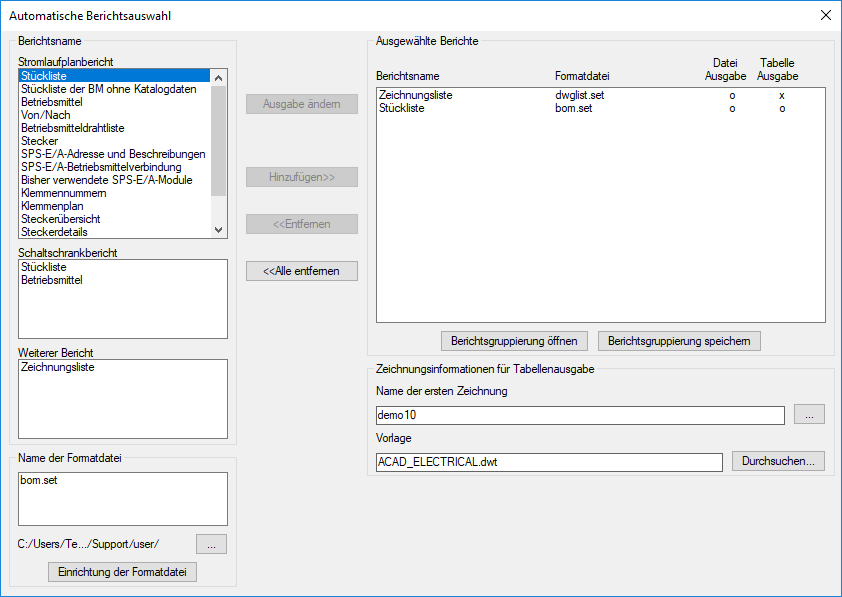 Wählen Sie den Berichtsnamen und Formatdatei (.set) für jeden Bericht, den Sie ausführen möchten. Die Formatdateien sollten entweder die Dateiausgabe, die Tabellenausgabe oder beides definieren.