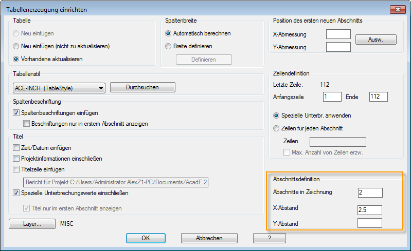 Wenn der Berichtsumfang auf Projekt festgelegt wurde, können Sie eine Berichtstabelle in mehreren Zeichnungen aufteilen. Wenn Sie wie oben beschrieben eine Unterbrechung definiert haben, können Sie festlegen, wie viele Tabellenabschnitte in jeder Zeichnung erstellt werden sollen.