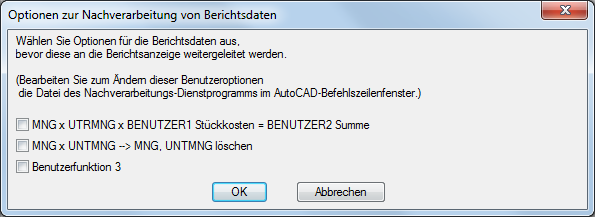 Zu jedem Berichtstyp gehören eine LISP-Datei (.lsp) und eine Dialogfeld-Definitionsdatei (.dcl), die zur Nachverarbeitung der Berichtsdaten angepasst werden können. Wenn Sie einen Bericht ausführen, werden die Daten im Dialogfeld Berichts-Generator angezeigt. Wenn Sie auf Benutzeroptionen klicken, wird das in der zugehörigen DCL-Datei definierte Dialogfeld angezeigt. Die tatsächlichen Verarbeitungsbedingungen für jede Option im Dialogfeld sind in der zugehörigen LSP-Datei definiert.