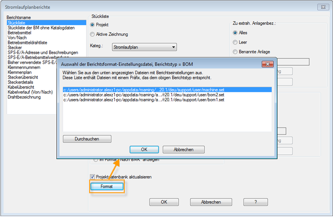 Berichte werden anhand einer Formatdatei (.set) vorab formatiert. Eine Formatdatei hängt vom Berichtstyp (z. B. Stücklisten- oder Betriebsmittelbericht) ab. Eine Formatdatei definiert Folgendes: