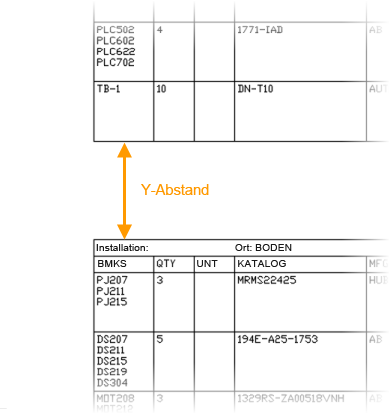 Die Abstandswerte auf der X- und Y-Achse definieren den Abstand zwischen dem Ende eines Tabellenabschnitts und dem Anfang des nächsten Tabellenabschnitts. Diese Vorgehensweise wird angewendet, wenn sich mehrere Tabellenabschnitte für einen Bericht in derselben Zeichnung befinden. Ein leerer Wert wird als Null interpretiert.