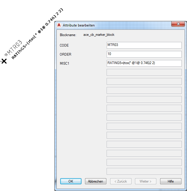 3. Bearbeiten Sie seinen MISC1-Attributwert unter Verwendung des Formats "{Attributname}=(AutoLISP-Ausdruck). Beispiel: Rechnen Sie den PS-Wert in Kilowatt um, und übertragen Sie diesen Wert in das Attribut RATING5 auf dem Motorsymbol. Geben Sie folgenden Ausdruck für das MISC1-Attribut des Bezeichnungsblocks ein: