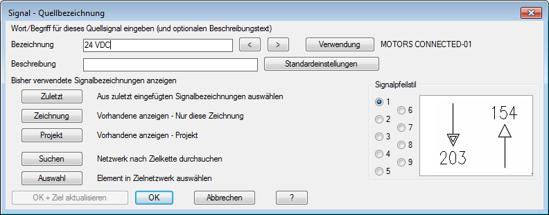 AutoCAD Electrical toolset unterstützt eine Beschreibungszeile für einen Quellpfeil. Diese Beschreibung kann auf den zugehörigen Zielpfeil übertragen werden. Sie können einige Standard-Beschreibungszeilen definieren, damit Sie sie nicht jedes Mal neu eingeben müssen, wenn Sie sie benötigen. AutoCAD Electrical toolset sucht nach einer Datei namens WDSRCDST.WDD. Dabei handelt es sich um eine einfache Textdatei; jede Zeile der Datei wird als einzelne Beschreibung gelesen. Wenn diese Datei vorhanden ist, steht in den Dialogfeldern Signal - Quellbezeichnung und Zielbezeichnung einfügen die Schaltfläche Standards zur Verfügung.