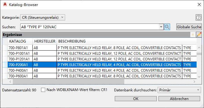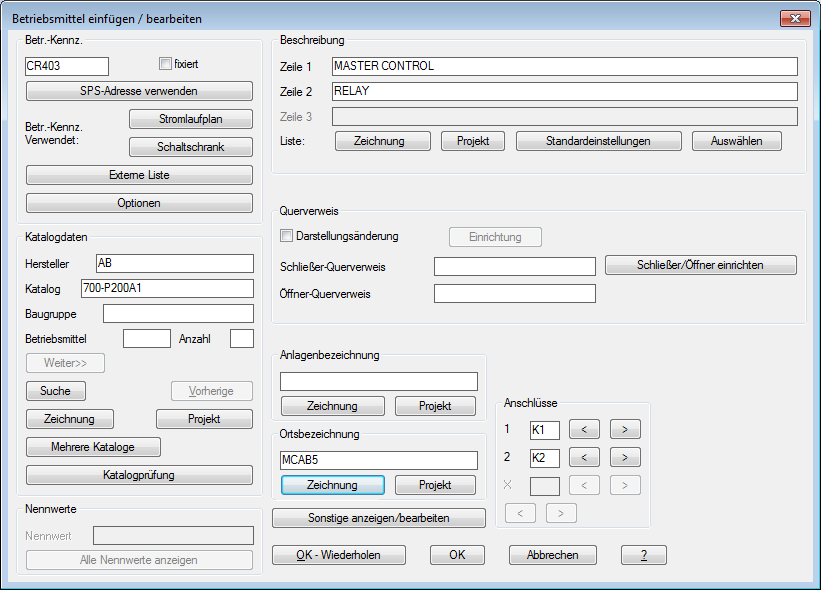 Die ausgewählte Herstellerbezeichnung und die ausgewählte Katalognummer werden im Dialogfeld Betriebsmittel einfügen/bearbeiten angezeigt. Wenn Sie im Dialogfeld auf OK klicken, werden die Werte auf das Symbol übertragen.