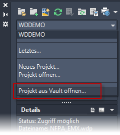 1. Wählen Sie im Projekt-Manager den Befehl Projekt aus Vault öffnen aus dem Projektauswahlmenü.