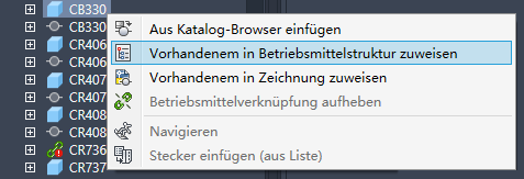 4. Wählen Sie in der Betriebsmittel-Strukturansicht das elektrische Betriebsmittel aus, das mit dem Inventor-Bauteil verknüpft werden soll. Die Betriebsmittel-Strukturansicht wird automatisch aktualisiert, um das verknüpfte Betriebsmittel anzuzeigen.