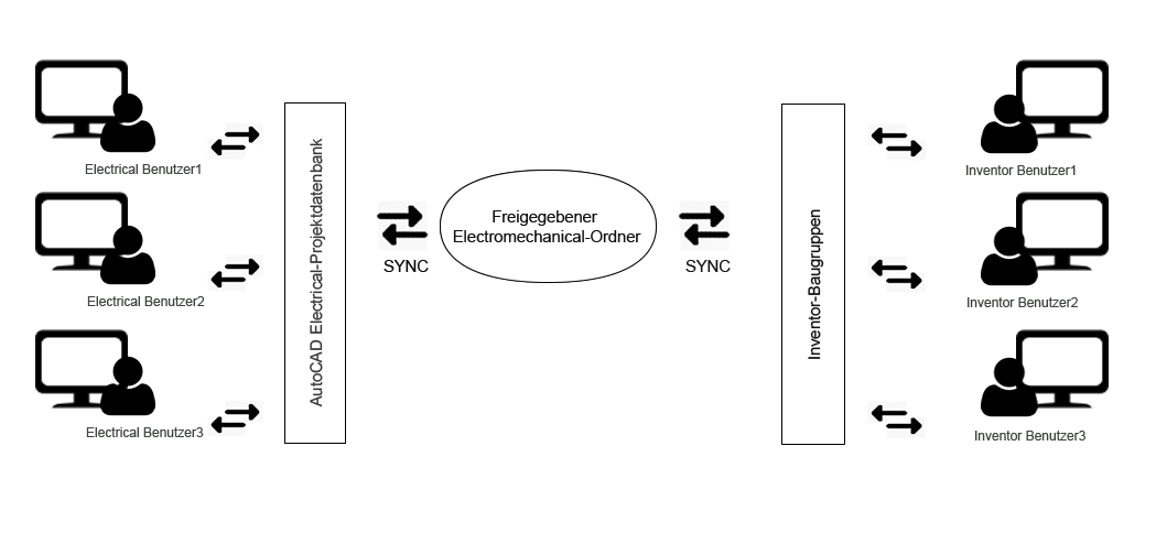 Mit dem elektromechanischen Projekt verwalten und pflegen Sie die Datenintegrität zwischen AutoCAD Electrical toolset- und Inventor-Projekten durch Synchronisierung. Bei der Synchronisierung von elektromechanischen Projekten wird während des Datenaustauschs eine beidseitige Aktualisierungsstrategie verwendet. Im Fall von AutoCAD Electrical toolsetBenutzern werden zuerst die Inventor-Daten abgerufen und die Betriebsmittel-Strukturansicht aktualisiert. Anschließend werden die AutoCAD Electrical toolset-Daten an Inventor übertragen. Die Synchronisierung schlägt fehl, wenn Sie nicht mit dem Netzwerk verbunden sind und die Verbindung zur Dateiverknüpfung unterbrochen ist. Sie können die Arbeit an Ihren Zeichnungsdateien jedoch offline fortsetzen und die Registerkarte Ortsansicht zum Verwalten der Betriebsmittel verwenden. Sie können die Offline-Arbeit später synchronisieren, nachdem Sie die Verbindung mit der Verknüpfungsdatei im Netzwerk wiederhergestellt haben.