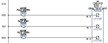 Verwenden Sie das Werkzeug Mehrere Betriebsmittel einfügen, um eine Folge von Grenztastern (Schließern) in Drähte einzufügen, die fest mit dem SPS-Modul verbunden sind.