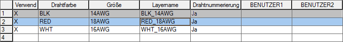 Das Dialogfeld Drahttyp ändern/konvertieren enthält eine Liste aller gültigen Drahtlayer, die für die aktive Zeichnung definiert sind. Der Drahtlayername und die Drahteigenschaften wie Farbe, Größe und benutzerdefinierte Eigenschaften werden im Raster angezeigt. Ein "X" in der Spalte Verwendet zeigt an, dass der Layername derzeit verwendet wird.