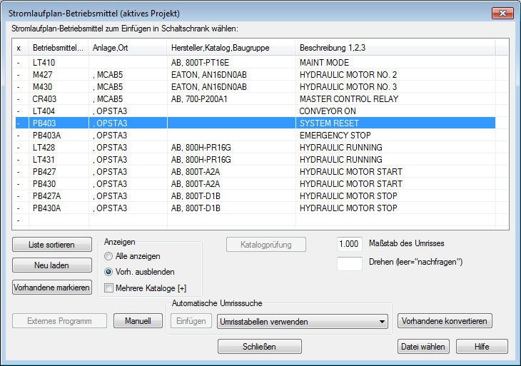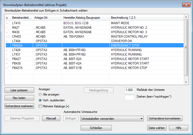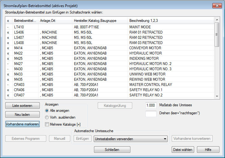 Klicken Sie im Dialogfeld Stromlaufplan-Betriebsmittel (aktives Projekt) auf Vorhandene markieren. Die bereits im Projekt platzierten Umrisse werden mit einem x markiert.