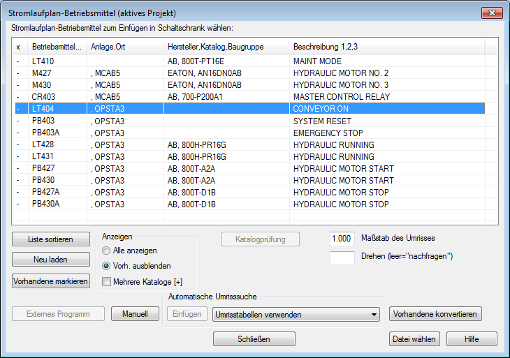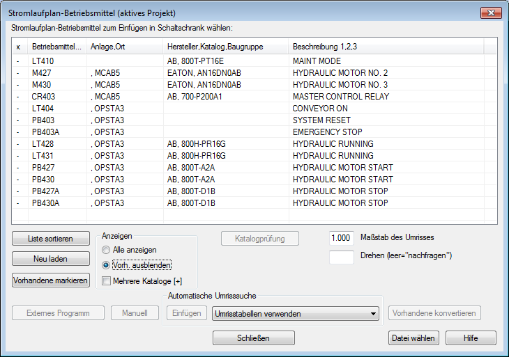 Das Dialogfeld Stromlaufplan-Betriebsmittel (aktives Projekt) wird erneut angezeigt. Sie können über die Stromlaufplanliste des Projekts weitere Betriebsmittel einfügen.