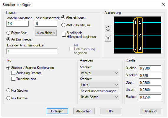 Das Dialogfeld zeigt den bisher eingefügten Steckeranschluss an. Klicken Sie so lange auf Nächste Verbindung einfügen, bis Sie sechs der neun Verbindungen platziert haben.