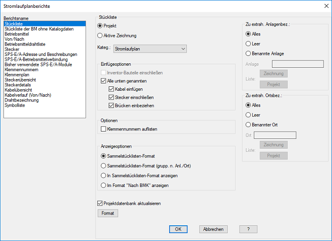 Geben Sie an, ob das Projekt, die aktive Zeichnung oder ausgewählte Objekte verarbeitet werden sollen. Wenn Projekt ausgewählt ist, bieten einige Berichte eine Option zur Auswahl der zu verarbeitenden Zeichnungen.