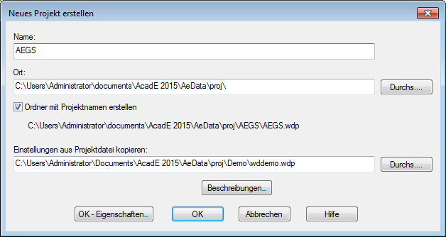 Sie müssen einen Namen eingeben, um die Projekteigenschaften definieren zu können. Die Erweiterung .wdp muss nicht in das Bearbeitungsfeld eingegeben werden.