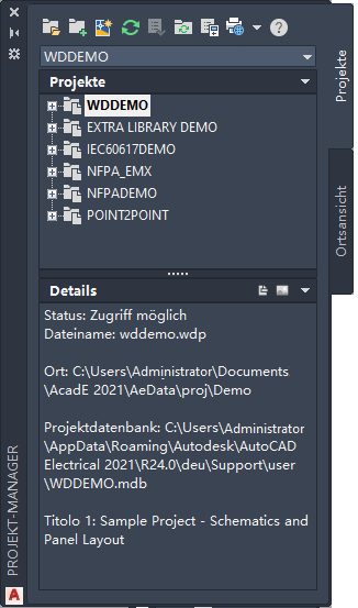 AutoCAD Electrical toolset ist ein projektbasiertes System. Jedes Projekt wird durch eine ASCII-Textdatei mit der Erweiterung .wdp definiert. Diese Projektdatei enthält eine Liste von Projektinformationen, die Standardeinstellungen für das Projekt, die Zeichnungseigenschaften und die Namen der Zeichnungsdateien. Sie können eine beliebige Anzahl von Projekten erstellen. Es kann jedoch immer nur ein Projekt aktiv sein.