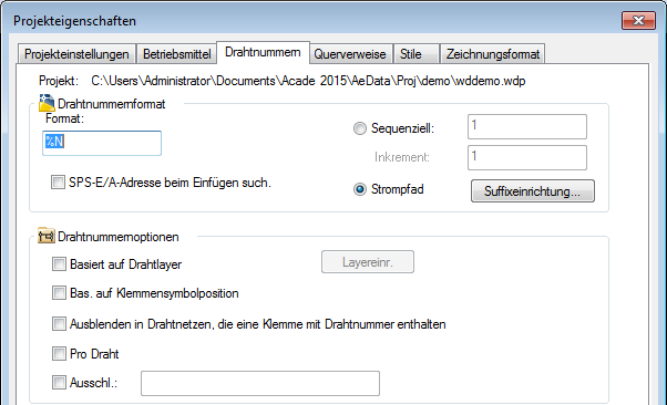 Durch diese Auswahl werden eindeutige querverweisbasierte Drahtnummern-Betriebsmittel-Kennzeichnungen für mehrere Drahtnetze erstellt, die am selben Verweisort beginnen. Bei Verwendung der querverweisbasierten Nummerierung sind Suffixvariablen erforderlich, damit die Eindeutigkeit von Drähten auf demselben Strompfad oder derselben Referenzzone gewährleistet ist. Klicken Sie auf Suffixeinrichtung, um die Suffixvariable zu ändern.