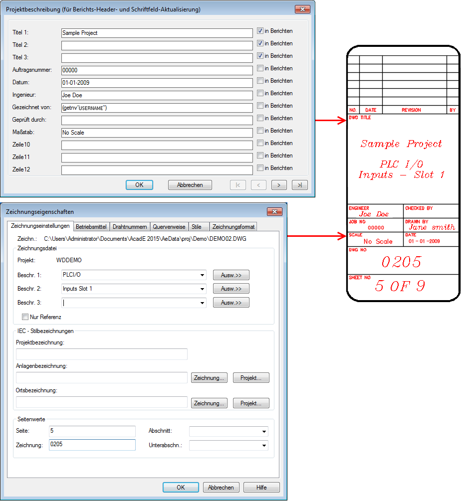 Verwenden Sie Schriftfeld einrichten, um die folgenden projekt- und zeichnungsspezifischen Werte Attributen im Schriftfeld zuzuordnen.