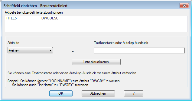 Sie können Systemvariablenwerte oder von AutoLISP-Programmen extrahierte Werte Attributen im Schriftfeld zuordnen.
