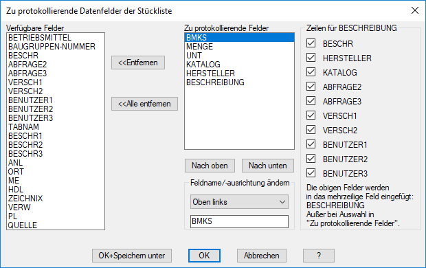 Berichtsfelder ändern: Öffnet ein Dialogfeld, in dem Sie die Felder festlegen, die in den Bericht aufgenommen werden sollen, sowie die Feldreihenfolge, Feldbeschriftungen und die Textausrichtung.