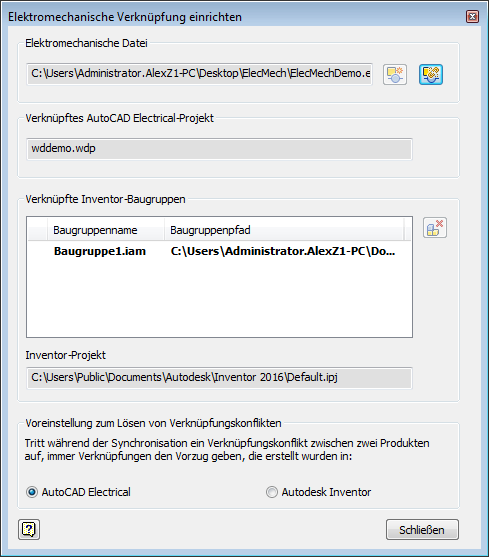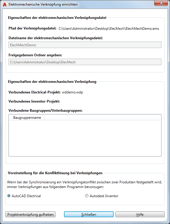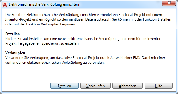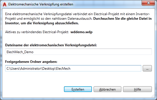 Erstellen Sie eine elektromechanische Verknüpfungsdatei, die ein AutoCAD Electrical toolset-Projekt mit einem Inventor-Projekt verbindet.