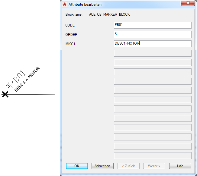 Suchen Sie in AutoCAD Electrical toolset nach dem Bezeichnungsblock, der den Einfügepunkt für das Motorsymbol definiert. Suchen Sie nach dem CODE-Attributwert, z. B. MTR03.