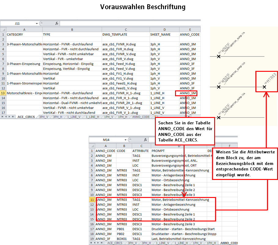 Diese Tabelle stellt eine Verbindung zwischen dem ausgewählten Schaltkreis (gekennzeichnet durch den ANNO_CODE-Wert), einem bestimmten Bezeichnungsblock (gekennzeichnet durch den CODE-Wert) und einem bestimmten Attribut im Bezeichnungsblock bereit.
