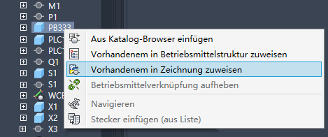 Wählen Sie in der aktiven Zeichnung das elektrische Betriebsmittel aus, das mit dem Inventor-Bauteil verknüpft werden soll. Die Betriebsmittel-Strukturansicht wird aktualisiert, um das verknüpfte Betriebsmittel anzuzeigen.