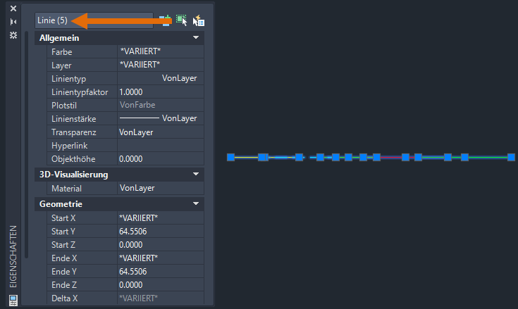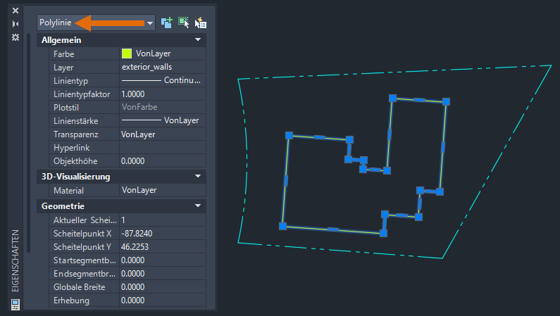 Wenn ich jetzt die fortlaufende Linie auswähle, wird sie in der Eigenschaftenpalette als Polylinienobjekt angezeigt.