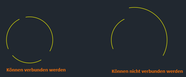 Beim Verbinden von Bogen, die einen gemeinsamen Mittelpunkt und Radius haben, müssen mindestens zwei Bogen verbunden werden. Sie können nicht mehrere Bogen verbinden, um einen geschlossenen Kreis zu erstellen.