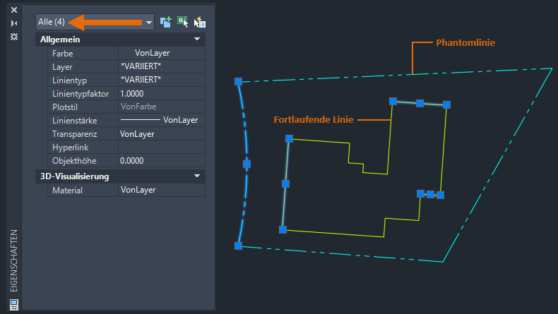 Wenn ich jetzt die fortlaufende und die Phantomlinie auswähle, werden in der Eigenschaftenpalette zwei separate Polylinienobjekte ausgewählt. In einer Instanz des Befehls VERBINDEN konnte ich viele Linien und Bogen zu mehreren Polylinien verbinden.