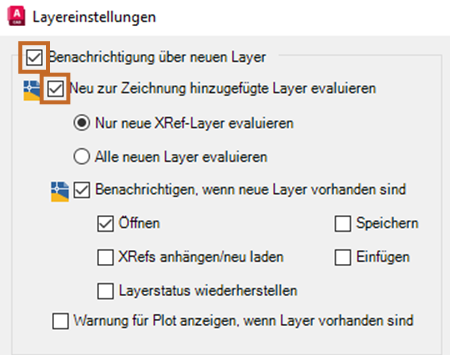 Jede Option gibt an, wann die Benachrichtigung angezeigt wird. Wenn also Öffnen ausgewählt ist und ein neuer Layer vorhanden ist, wird eine Benachrichtigung angezeigt, wenn Sie die Zeichnung öffnen. Wenn Speichern ausgewählt ist und ein neuer Layer vorhanden ist, wird bei jedem Speichern eine Benachrichtigung angezeigt.